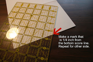 Now measure 1/4 inch down from the score line you just made. You will want to place a pencil mark at the side and bottom edge so that you can line it up on your score tool. Repeat this measurement on the other side of the card. Now score between your two marks.